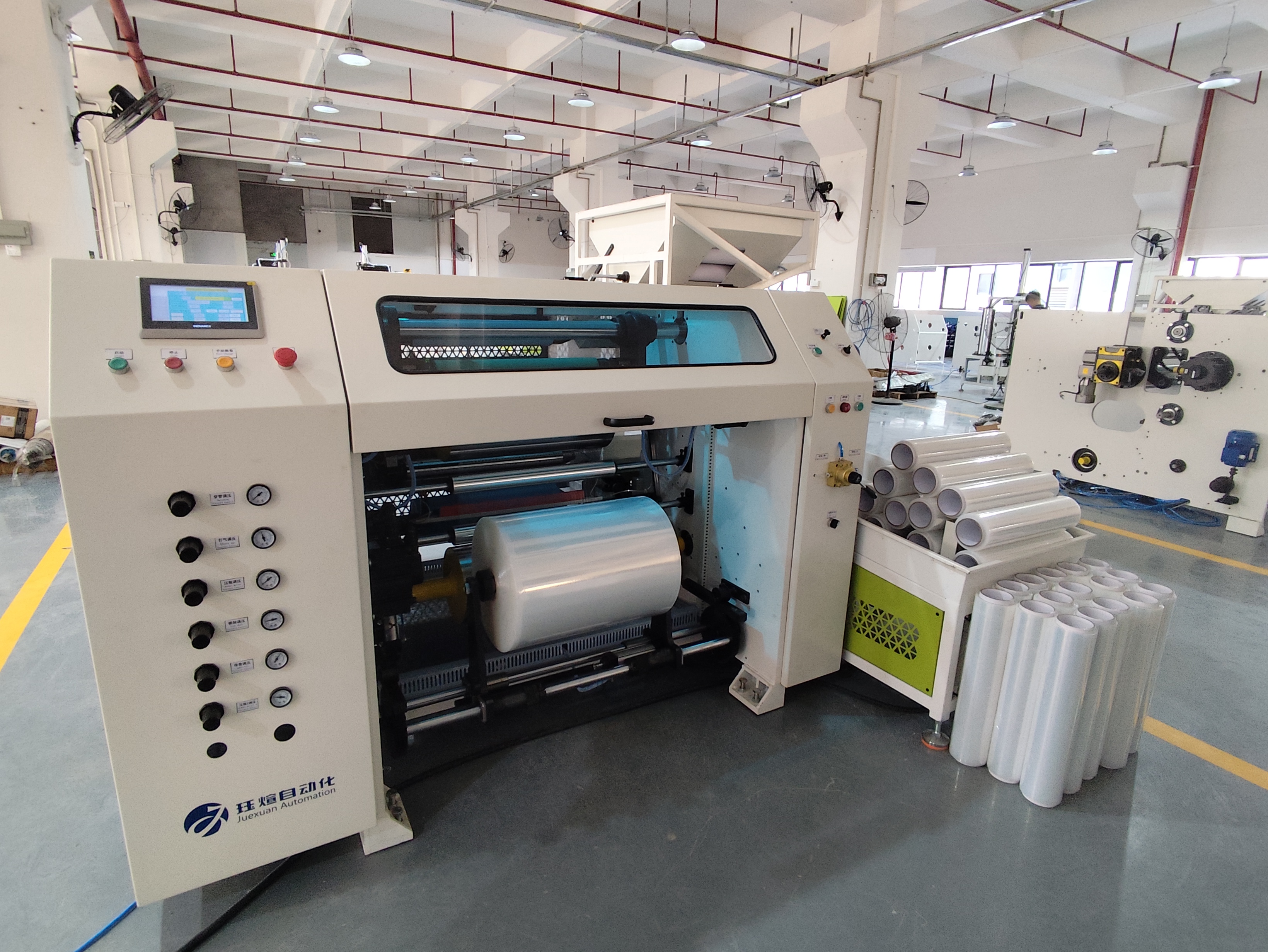 This is one of our star machines. This is an fully automatic stretch film with core and without core four-shafts rewinding machine.This equipment integrates numerous advantages. The entire rewinding process is automated and equipped with the servo system for precise control, ensuring efficient production. This machine is convenient to opreate, which greatly save the cost and creates greater value.